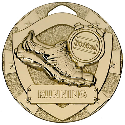 Gold Shield running medal with a running shoe, stopwatch.and wordingSee our medal ribbons section for clip on coloured ribbons.